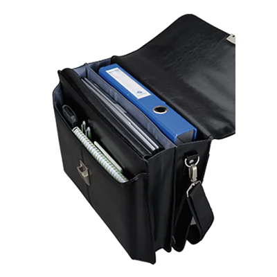 Hochwertige Aktentasche aus schwarzem Leder mit abnehmbarem Schultertragegurt. Das Hauptfach ist unterteilt, wobei das eine Fach als Organisationsfach dient und über Stifteschlaufen, Visitenkartenfächer und A4 Fächer verfügt. Außerdem befinden sich jeweils auf der Vorder- und Rückseite eine weiteres Fach für Ihre Dokumente.