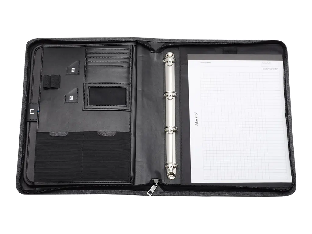- Dokumentenfach, herausnehmbare Ring-Mechanik, zwei Einsteckfächer, gepolstertes Tabletfach, zwei SD-Karten Fächer, sechs Kartenfächer