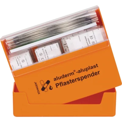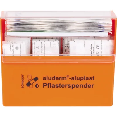 aluderm®-aluplast Wundpflastern, elastisch, in den fünf am häufigsten benötigten Größen. Gefüllt mit aluminiumbedampftem aluderm®-aluplast Wundpflaster in verschiedenen Abmessungen. Jede Sorte im eigenen Fach, sichere, übersichtliche und griffbereite Aufbewahrung, einfaches Nachfüllen, bedarfsgerechte Entnahme, Schutz vor Verschmutzung, erhöhte Lagerfähigkeit und Haltbarkeit. aluderm®-aluplast - das Wundpflaster mit aluderm®. aluderm®-aluplast ist das besondere Wundpflaster mit aluminiumbedampfter aluderm®-Wundauflage. aluderm® verklebt nicht mit der Wunde, fasert nicht, ist stark saugend, kann bei der Hautbildung und Heilung helfen, ist atmungsaktiv. aluderm®-aluplast elastisch: Trägermaterial hochelastisches Polyestervlies, weiß, besonders hautfreundlich, gut luftdurchlässig, wasserabweisend. Der Polyacrylatkleber wird durch Körperwärme zusätzlich aktiviert. Besonders anschmiegsam, passt sich allen Bewegungen an, hypoallergen, reizfrei.