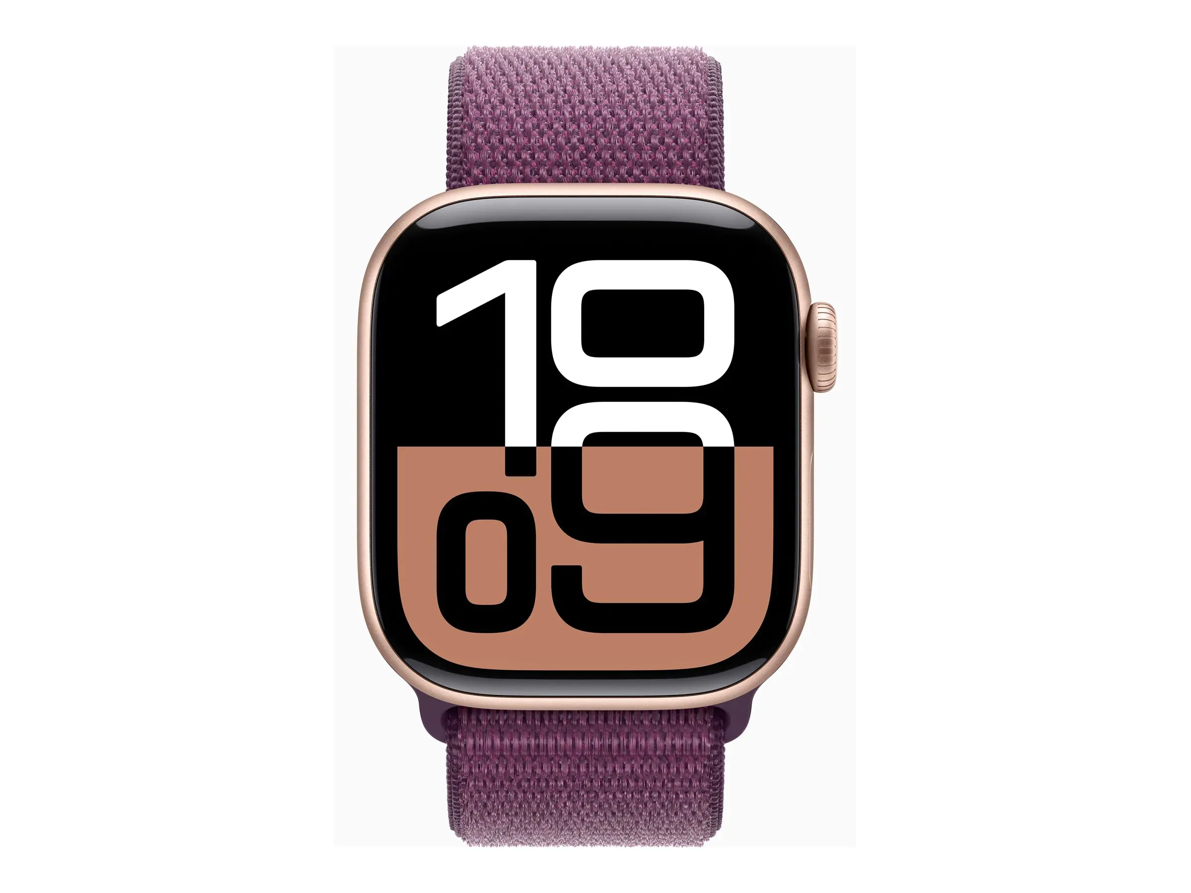 Apple Watch Series 10 (GPS + Cellular) - 42 mm - Aluminium, Roségold - intelligente Uhr mit Sportschleife - weiches, zweilagiges Nylon - Pflaume - Handgelenkgröße: 130-200 mm - 64 GB - LTE, Wi-Fi 4, UWB, Bluetooth - 4G - 29.3 g