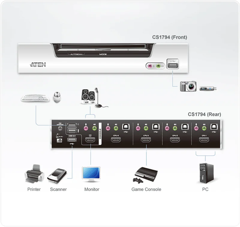 Produktbeschreibung | ATEN CubiQ CS1794 USB 2.0 HDMI KVMP Switch - KVM-/Audio-/USB-Switch - 4 Anschlüsse | |||