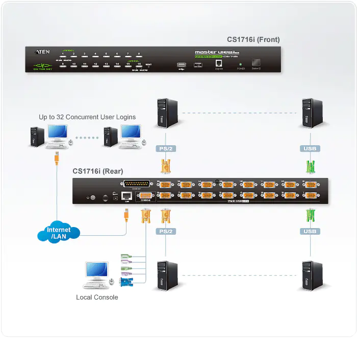 KVM on the NET CS1716i - KVM-Switch - PS/2, USB 16 Anschlüsse, 1 lokaler Benutzer, 32 IP-Benutzer, 1U, extern, stapelbar