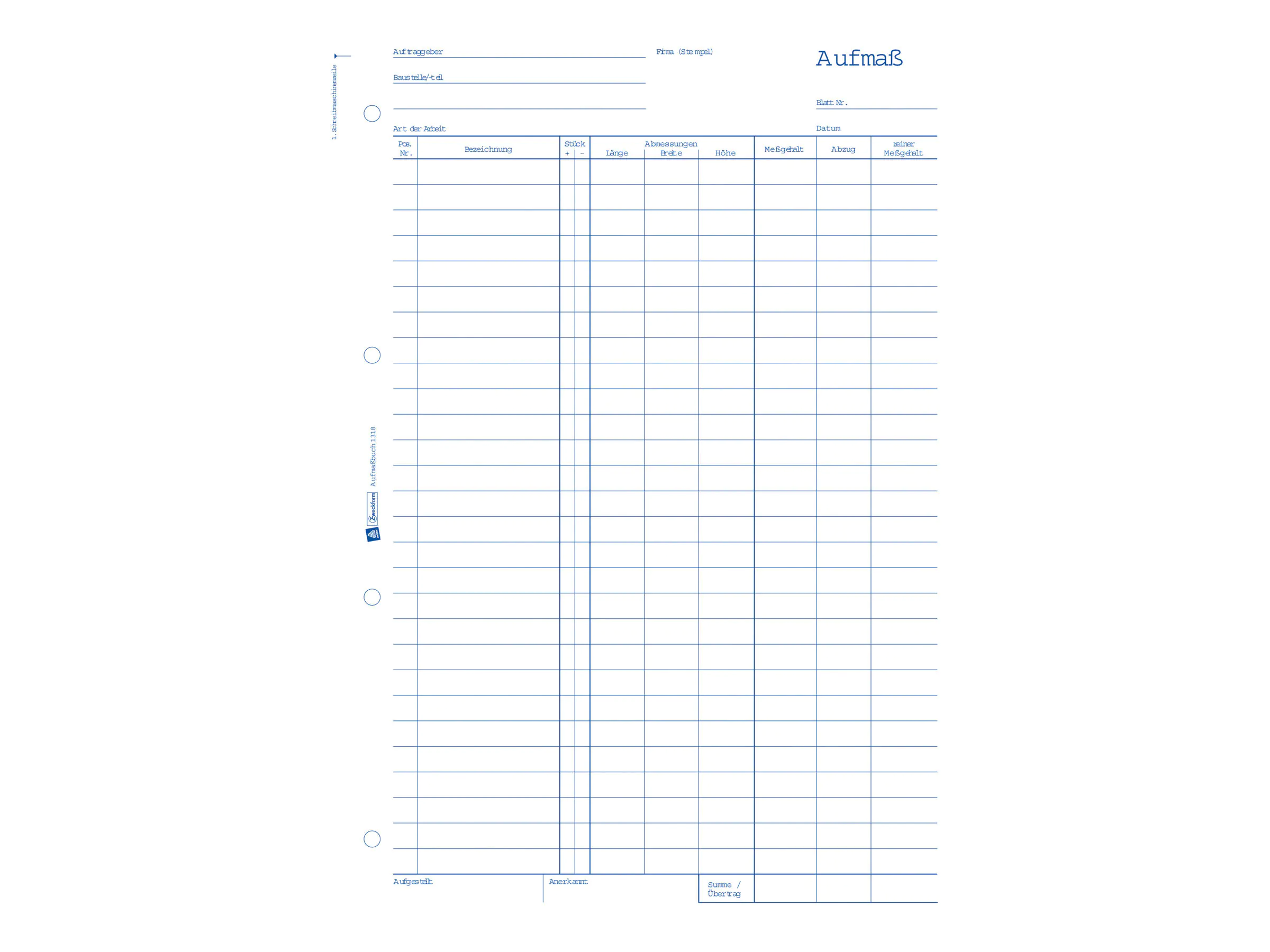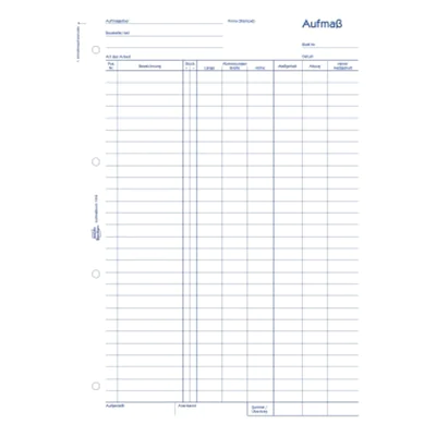 Die Bauformulare von Avery Zweckform sind unverzichtbare Helfer für Bau und Handwerk. Das Aufmaßbuch eignet sich besonders, um den Materialverbrauch zu dokumentieren. Das Aufmaßbuch im DIN A4 Format beinhaltet 2 Blatt Blaupapier. Die Bauformulare von Avery Zweckform sind vorgelocht, für eine schnelle Ablage!