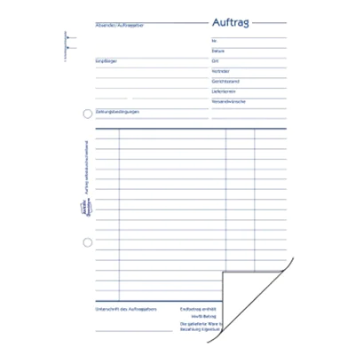 Stellen Sie sicher, dass Sie bei der Vergabe von Aufträgen keine wesentlichen Details übersehen. Die Aufträge von Avery Zweckform bieten Ihnen die Möglichkeit alle nötigen Angaben abzudecken. Der Auftrag im DIN A5 Format beinhaltet 1 Blatt Blaupapier und ist mit Schreibmaschinen gerechtem Zeilenabstand ausgestattet.