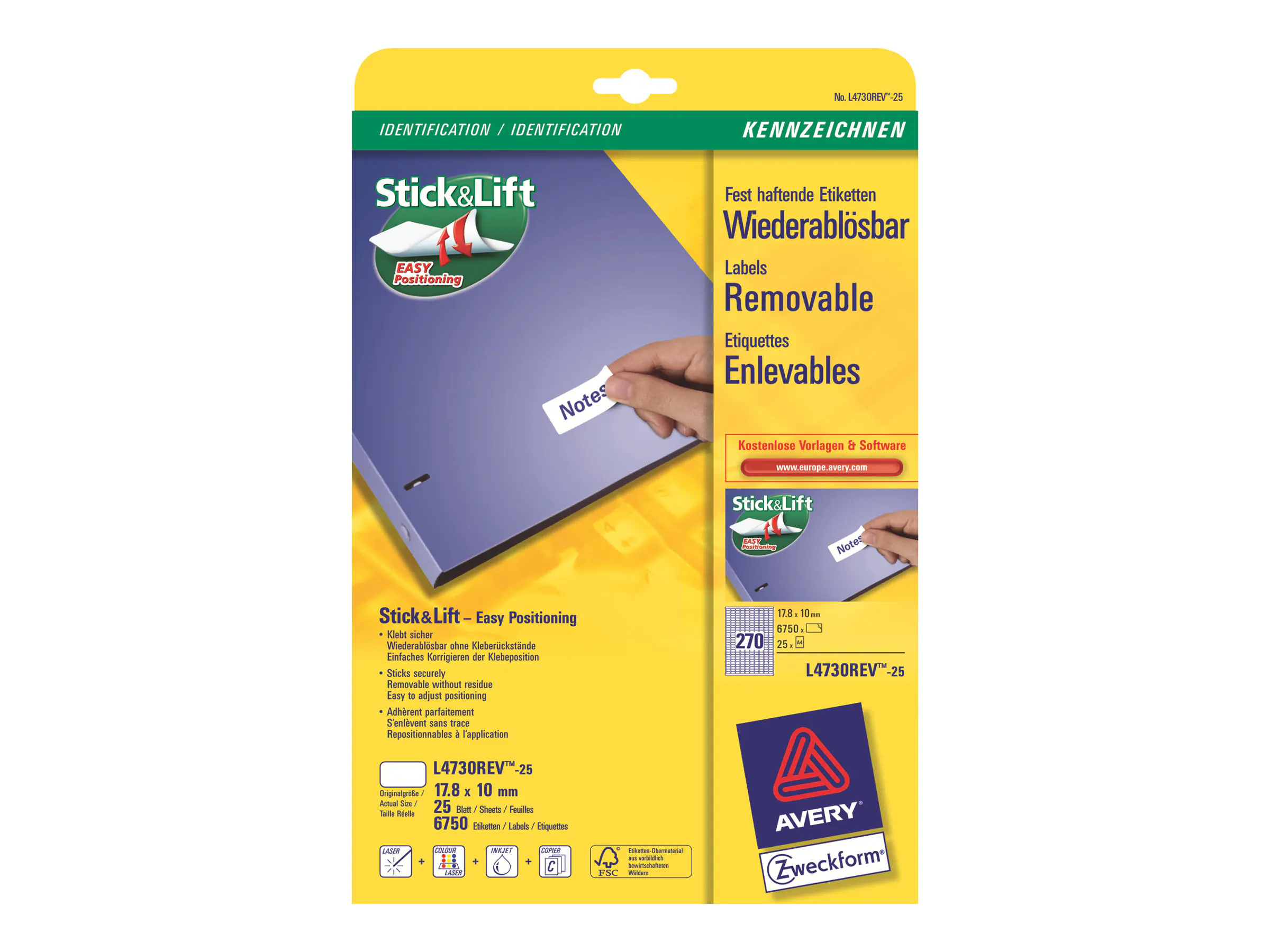Die wiederablösbaren Universal-Etiketten von Avery Zweckform lassen sich mit allen gängigen Druckern und Kopierern bedrucken und garantieren einen staufreien Druckerdurchlauf. Diese Aufkleber bieten Ihnen für jeden Bedarf und Anwendungsbereich die passende Lösung und sind rückstandsfrei wiederablösbar. Kostenlose Software und Vorlagen finden Sie unter www.avery.eu/print.
