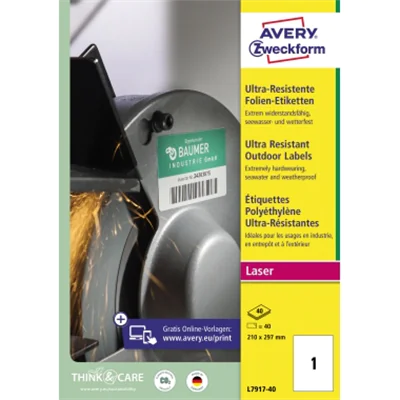 Haftung auch auf schwierigen Oberflächen und eignen sich besonders zur Kennzeichnung in der Produktion und im Lager, zur Beschriftung von Containern oder zur Beschilderung. Extrem widerstandsfähig und seewasserfest. Gestalten und drucken Sie Ihre Aufkleber schnell und einfach - mit den kostenlosen Avery Zweckform Etiketten Vorlagen und Software-Lösungen unter www.avery.eu/print oder den im Microsoft® Office Paket integrierten Basis-Vorlagen.