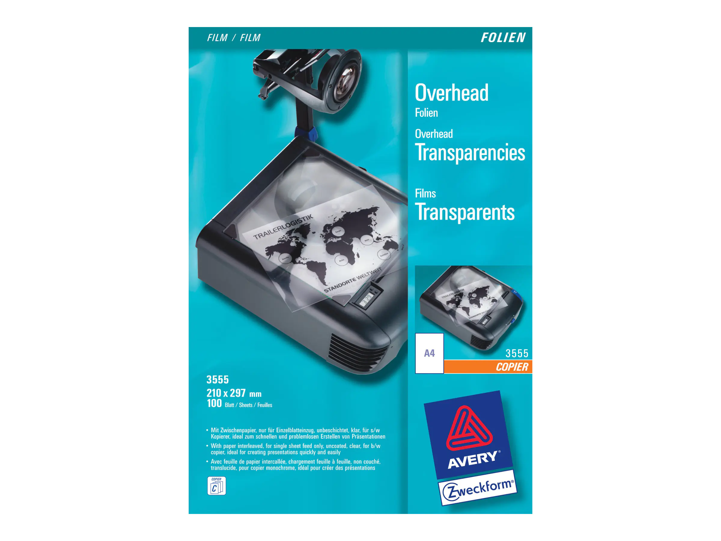 Overheadfolien von Avery Zweckform eignen sich optimal für Schulungen oder für Präsentationen in Ihrer Firma. Die Overheadfolie ist für S/W-Kopierer geeignet. Sie ist unbeschichtet, lösemittelfrei und ist nur für Einzelblatteinzug konzipiert.
