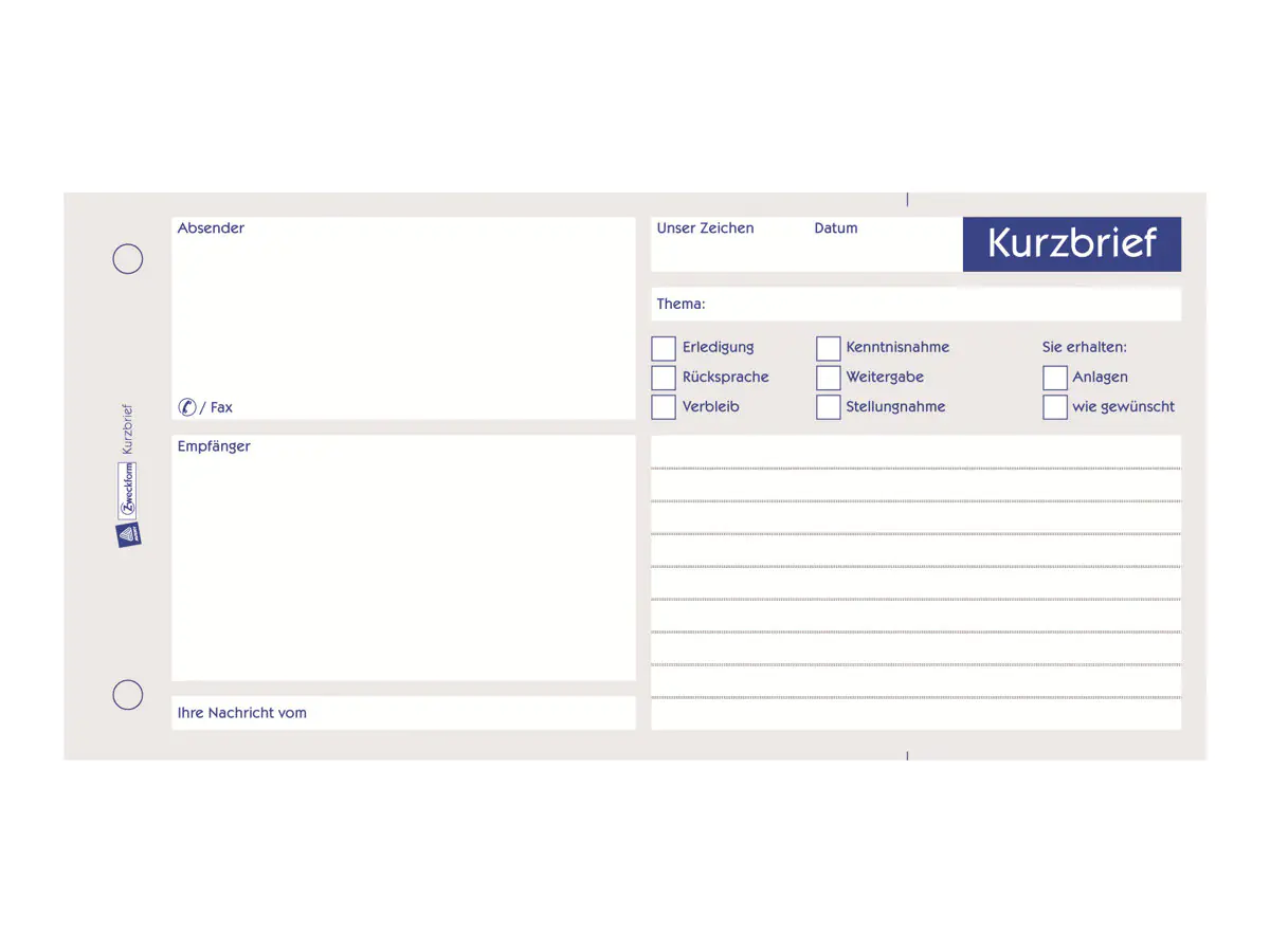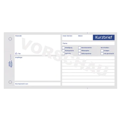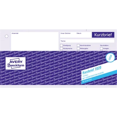 Nie mehr etwas vergessen - mit dem Kurzbrief von Avery Zweckform. Der Kurzbrief enthält bereits die wichtigsten Punkte zum Ankreuzen, z.B. zur Erledigung, Rücksprache, Stellungnahme, etc. Der Kurzbrief im 1/3 DIN A4 Format ist mit 1 Blatt Blaupapier ausgestattet.
