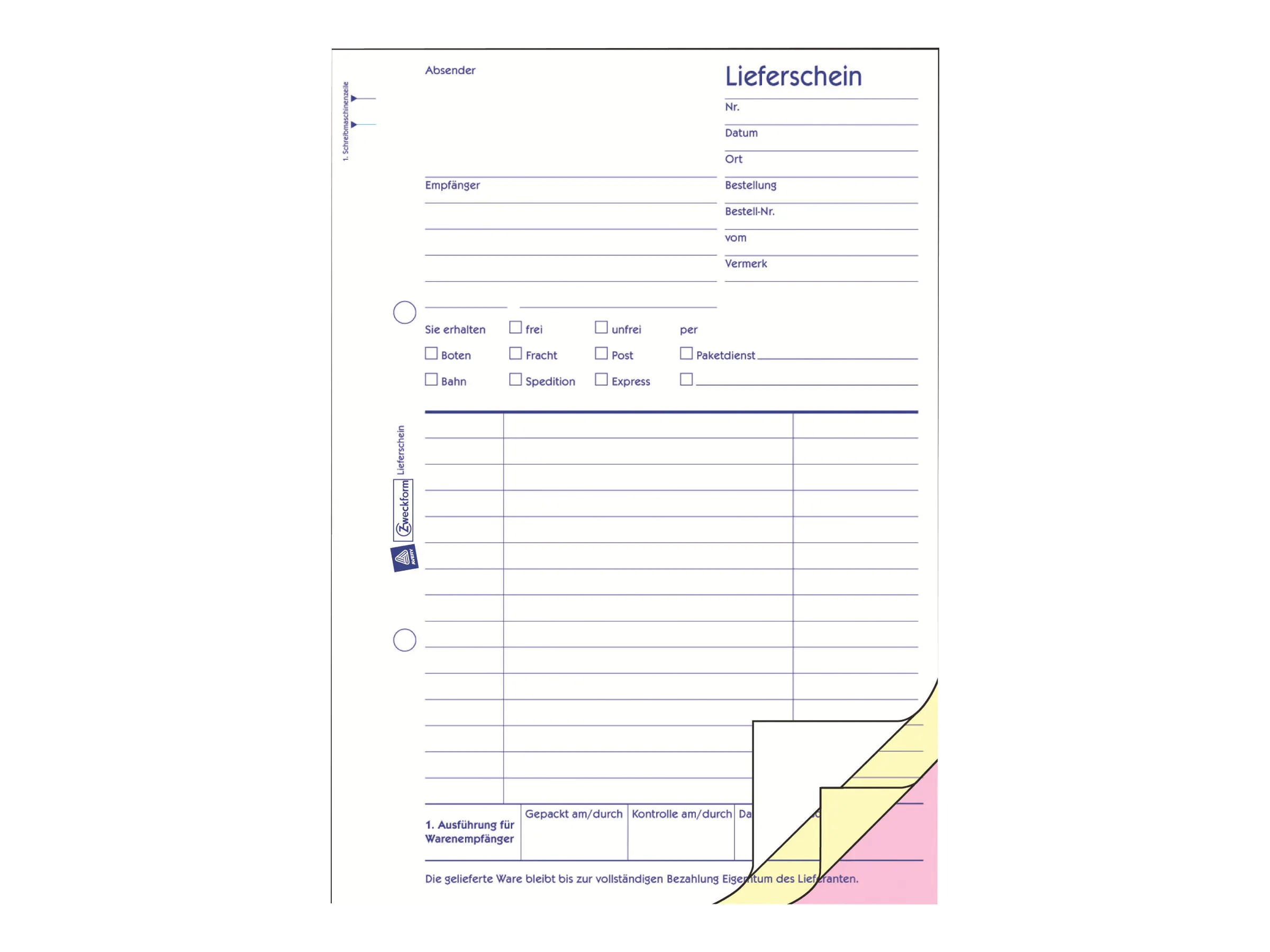 - Farbe des Durchschlages: gelb, rosa