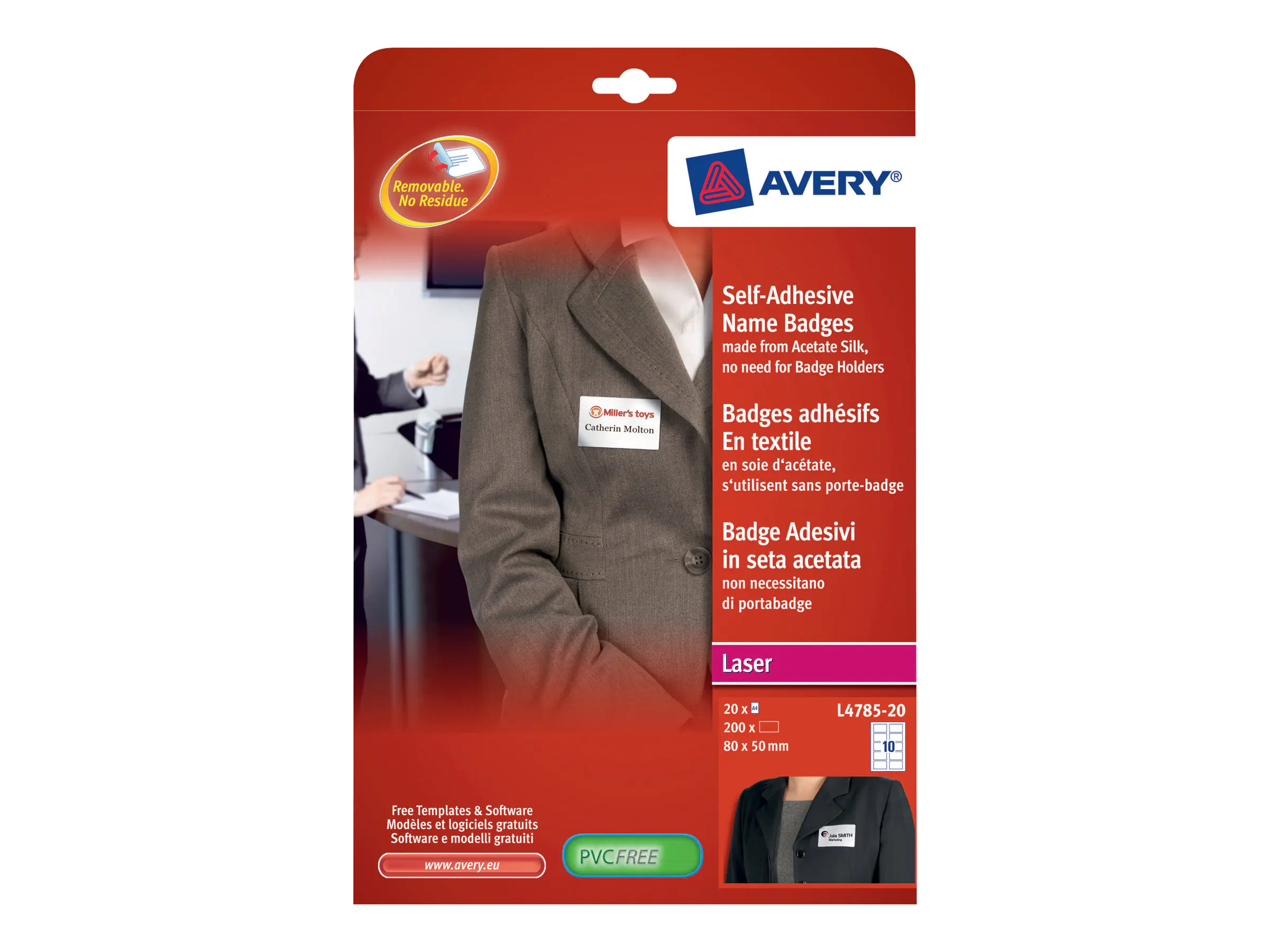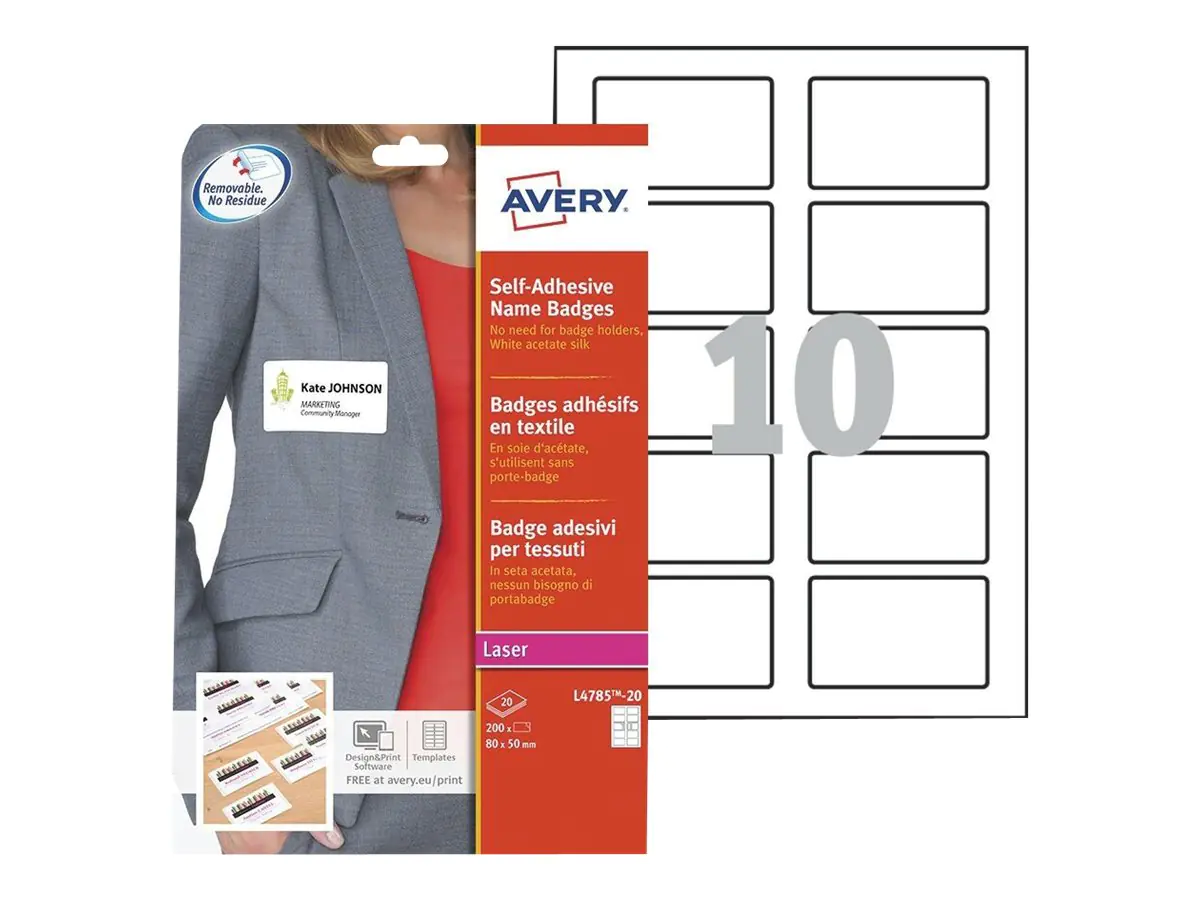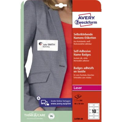 Die Namensetiketten erleichtern Ihnen die Organisation von Veranstaltungen, Seminaren und Konferenzen. Sie sind die perfekte Alternative zu Plastikschildern mit Nadel oder Clip. Die Namensschilder haften zuverlässig auf Kleidung und Textilien. Die Rückseiten-Stanzung der Namensschilder erlaubt das einfache Heraustrennen der Namensetiketten samt Trägerfolie für eine spätere Verwendung. Die Textil-Etiketten sind nicht geeignet für Leder, Seide, Samt und andere empfindliche Textilien. Die Namensetiketten bieten einen garantiert staufreien Druckerdurchlauf auf allen gängigen Laser-Druckern. Gestalten und bedrucken Sie Ihre Namensschilder schnell und einfach - mit den kostenlosen Avery Zweckform Etiketten-Vorlagen unter www.avery.eu/print.