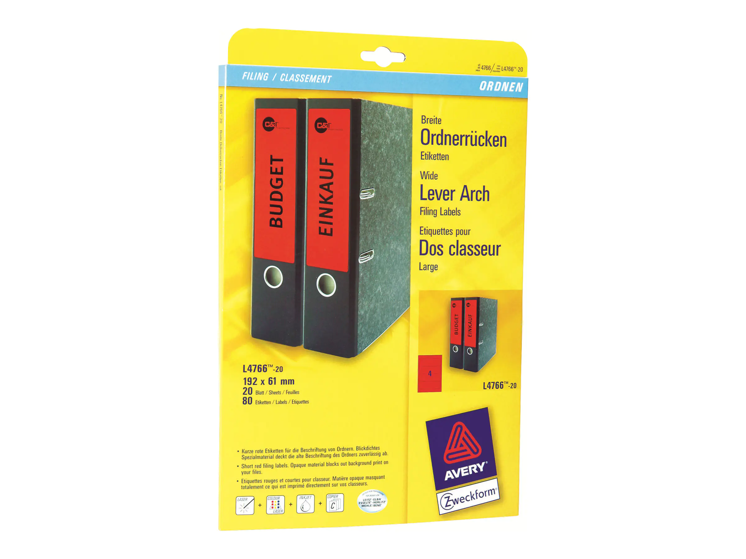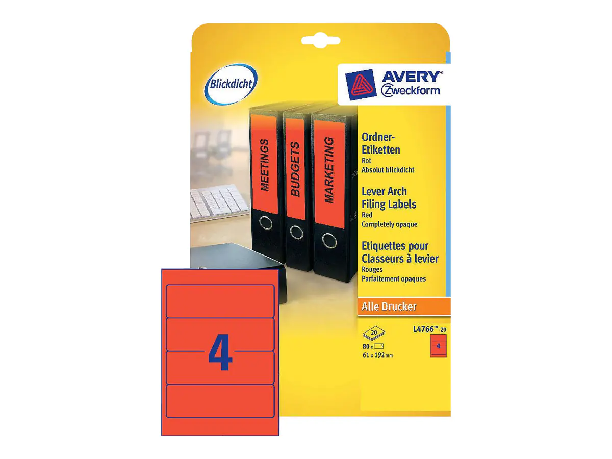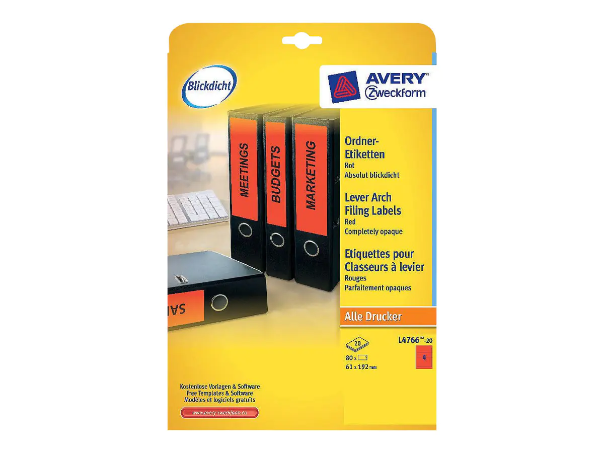 Präziser Druckereinzug und garantiert staufrei dank innovativer ultragrip Technologie. Problemloser Druckerdurchlauf für Laserdrucker bestätigt. Halten Sie Ordnung in Ihren Unterlagen mit bedruckbaren Ordner-Etiketten. Die alte Beschriftung scheint nicht durch. Die Rückenschilder lassen sich mit allen gängigen Druckern und Kopierern bedrucken. Gestalten und bedrucken Sie die Ordner-Etiketten mit unserer kostenlosen und benutzerfreundlichen Software. www.avery-zweckform.eu/print.