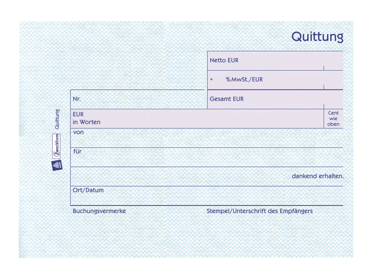 Bestätigen Sie den Verkauf von Waren oder Dienstleistungen mit den Quittungen von Avery Zweckform. Die Quittung, MwSt. separat ausgewiesen, ist mit einem feinen, netzartigen Hintergrunddruck ausgestattet. Somit ist die Quittung garantiert fälschungssicher. Profitieren Sie von der langjährigen Erfahrung vom Formularexperten Avery Zweckform.