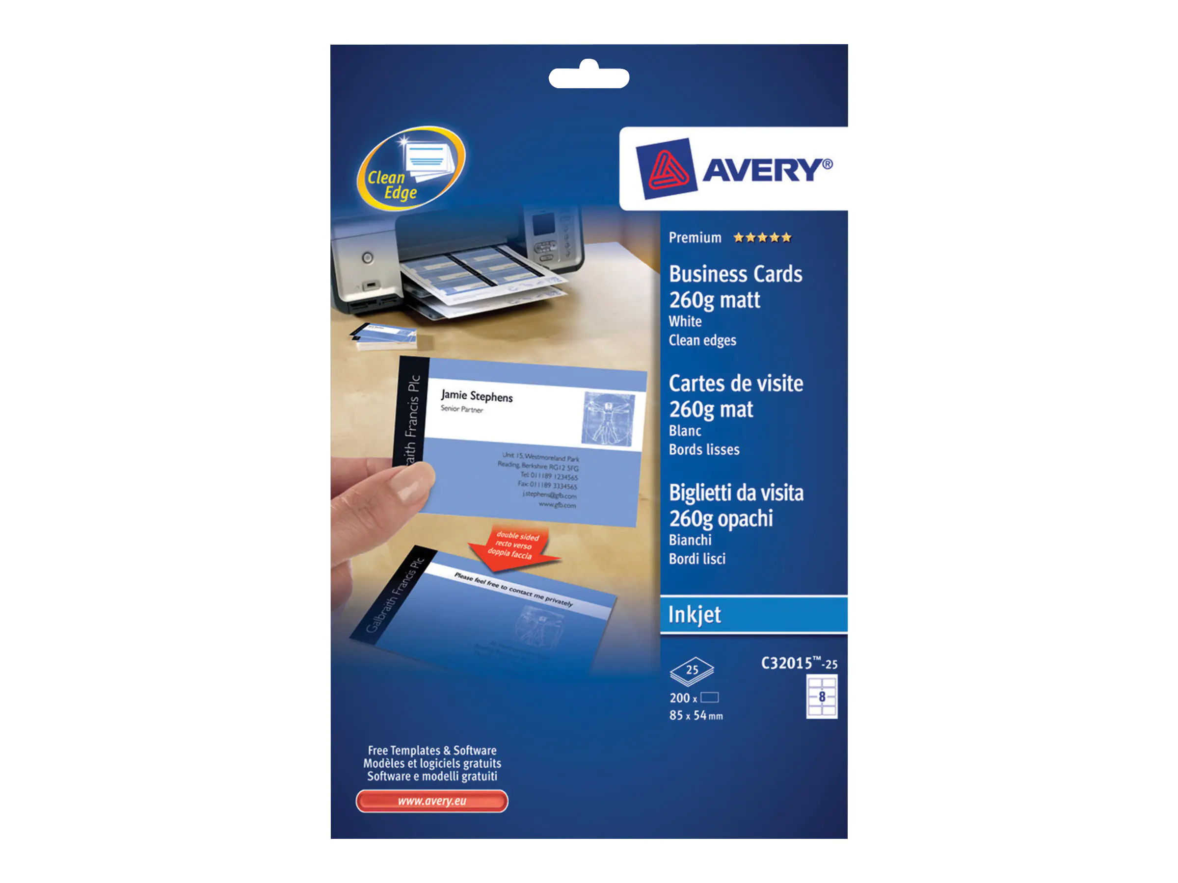 Gestalten und drucken Sie Ihre Visitenkarten selbst und vermeiden Sie Wartezeiten bei externen Druckereien! Die Premium Visitenkarten von Avery Zweckform garantieren exzellente Druckqualität durch die matte Inkjet-Spezialbeschichtung. Die beidseitig bedruckbare Visitenkarte hat dank patentierter Quick&CleanT Technologie absolut glatte Kanten. Auf der Rückseite finden zusätzliche Informationen wie Öffnungszeiten, Anfahrtsskizze oder Serviceleistungen Platz. Mit der Avery Zweckform Software Design & Print Online erstellen und drucken Sie Ihre Visitenkarten schnell und einfach am eigenen PC!