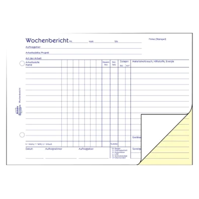 Die Bauformulare von Avery Zweckform sind unverzichtbare Helfer für Bau und Handwerk. Der Wochenbericht eignet sich besonders, um die wöchentliche Arbeitsleistung und den Materialverbrauch zu dokumentieren. Der Wochenbericht im DIN A5 Querformat beinhaltet 2 Blatt Blaupapier. Die Bauformulare von Avery Zweckform sind vorgelocht, für eine schnelle Ablage!