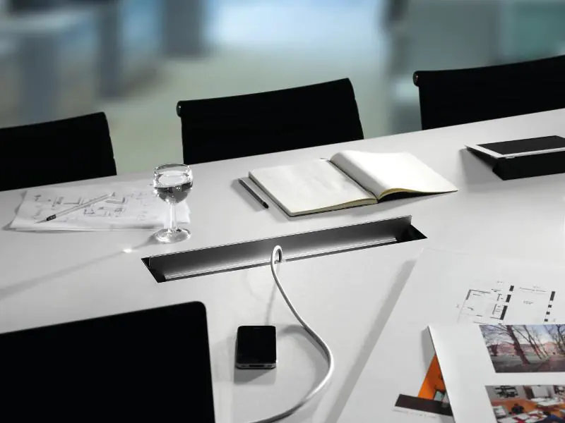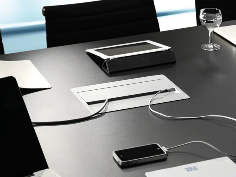 Conference Einbaurahmen gibt es sowohl für den nachträglichen Einbau, als auch für den bündigen Einbau in Tischplatten. Beim Untertischeinbau sind Öffnungs- und Verschlussklappe bündig mit der Tischoberfläche.