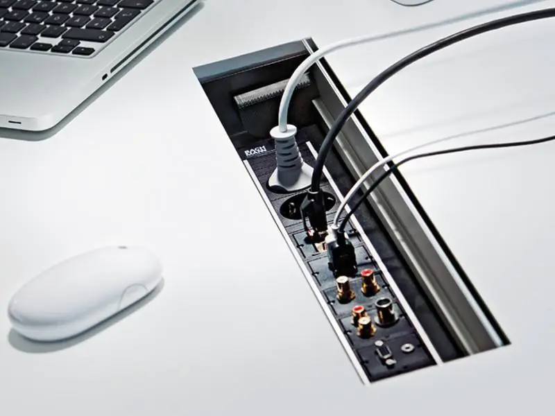 Die Konfiguration der Datenanschlüsse kann bei Conference frei gewählt werden. Darüber hinaus besteht jederzeit die Möglichkeit, die jeweilige Steckdoseneinheit schnell und ohne Werkzeug auszuwechseln. Damit höchste Funktionalität und hochwertiges Design über viele Jahre den Entwicklungen der Kommunikationstechnik angepasst werden können.
