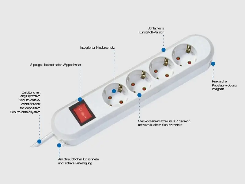 Die kompakten Maße, das robuste Design aus schlagfestem Kunststoff, der integrierte Kinderschutz und die zahlreichen Produktvarianten machen die Bachmann SMART Steckdosenleiste 381.249K zu einem funktionalen Werkzeug für die Stromverteilung im Büro, Zuhause und weiteren Einsatzorten. Die SMART Steckdose lässt sich einfach und sicher durch die vorhandenen Anschraublöcher fest anbringen.