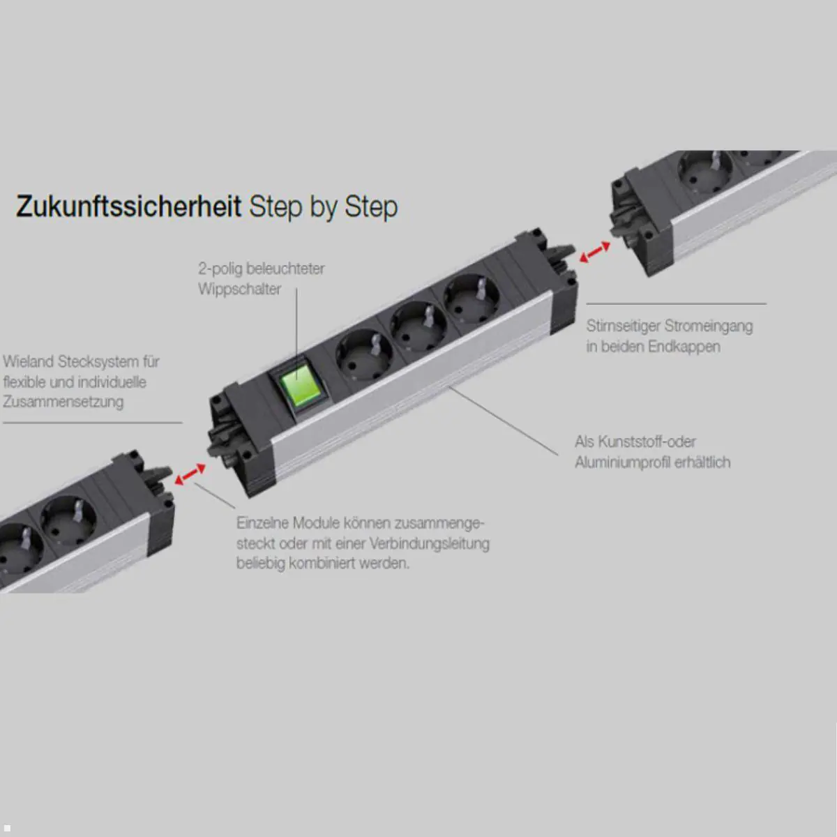 Die modulare mehrfach Steckdosenleiste STEP BASE (906.18821) aus der Bachmann STEP Serie verwirklicht das Prinzip der Anpassungsfähigkeit mit absoluter Konsequenz. Das STEP System ist ideal für die flexible Energie- und Datenversorgung in Trennwandsystemen, an Arbeitsplätzen, in Doppelböden und weiteren Verbindungsanwendungen. Die STEP-Steckdosenleiste bietet dank ihrer Modularität nahezu grenzenlose Möglichkeiten. Sie verfügt über einen Stromeingang und einen Stromausgang, die jeweils stirnseitig in den Endkappen integriert sind.