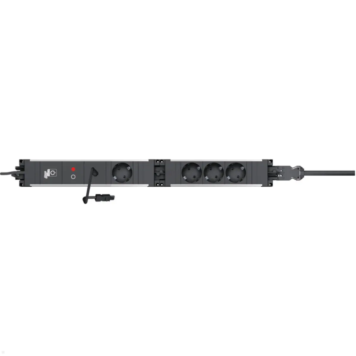Für die Stromversorgung ist sie standardmäßig mit einem Wieland GST18i3 Stecker und einer GST18i3 Kupplung ausgestattet. Die Gerätezuleitung kann separat erworben werden, um verschiedene Leitungseingänge zu ermöglichen. Die Mehrfachsteckdose hat 5 Schutzkontaktsteckdosen und der zentraleinsatz der Leiste ist um 35 Grad gedreht, damit das Einstecken von breiten Steckern erleichtert wird. An der Steckdosen Leiste können permanent aufgestellte Geräte wie PC, Monitor, Drucker usw. angeschlossen werden.