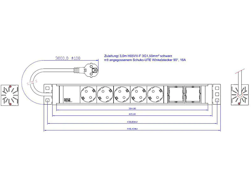 - Stromeingang: 3,0 m H05VV-F3G1,5mm² mit Winkelstecker 90 Grad