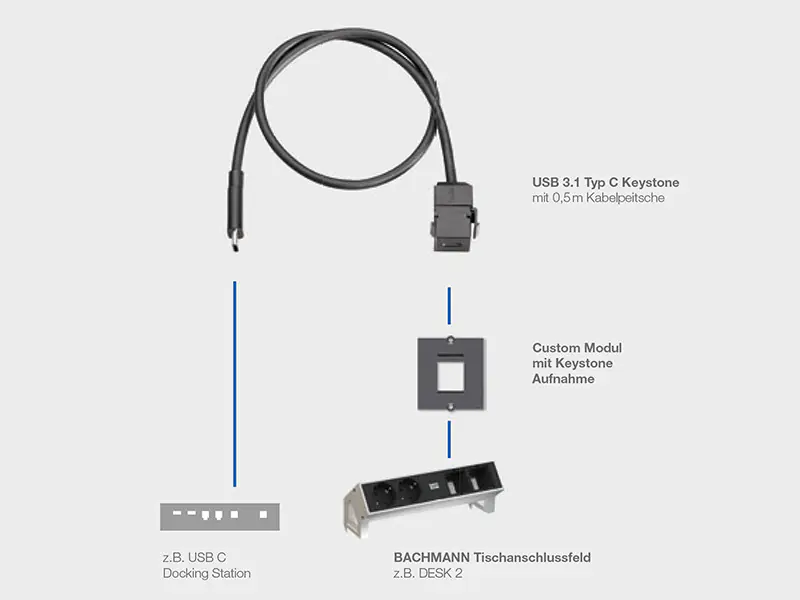 Bachmann bietet mit dem USB 3.1 Typ C Generation 1 die passende Schnittstelle an. Der flexible Baustein kann einfach und schnell in alle konfigurierbaren Bachmann Tischanschlussfelder mit modularer Keystone Aufnahme eingesetzt und direkt genutzt werden. Auch der nachträgliche Wechsel ist problemlos möglich. Dadurch sind auch bereits installierte Bachmann Produkte bereit für die Zukunft. Das Modul ist mit einem 0,5 m Kabel mit einem USB C Stecker versehen.