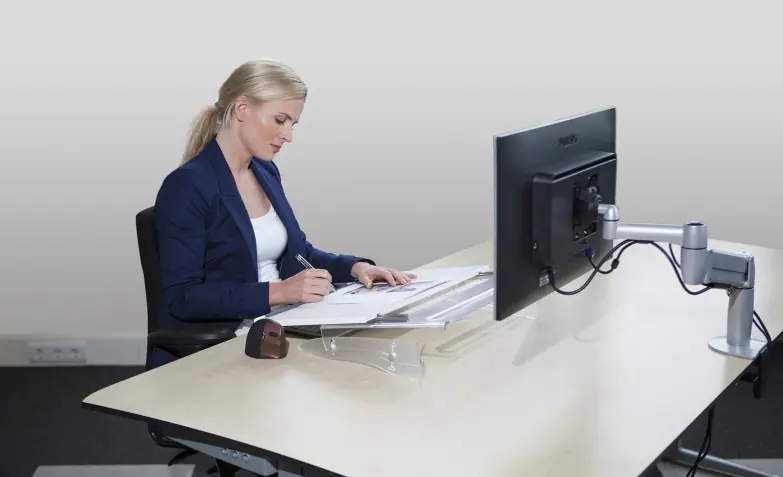 Mit dem flexiblen Dokumentenhalter FlexDesk 630N wechselt man leicht und effizient zwischen Schreib- und Computerarbeit.