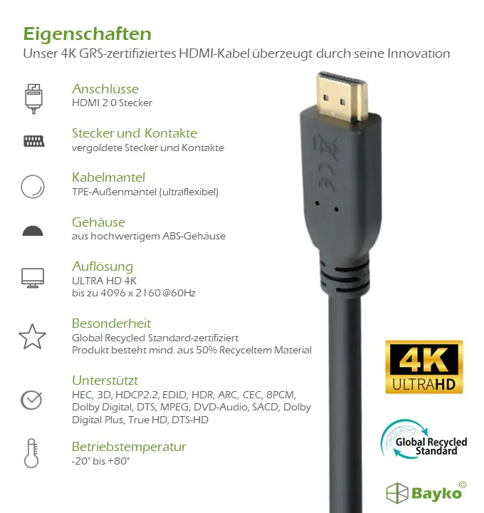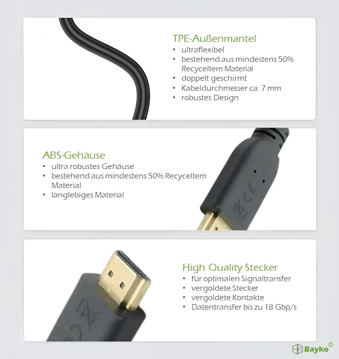 Erleben Sie die perfekte Kombinatio aus Leistung und Umweltbewusstsein mit dem Bayko GREEN PERFORMANCE HDMI 2.0 Anschlusskabel.