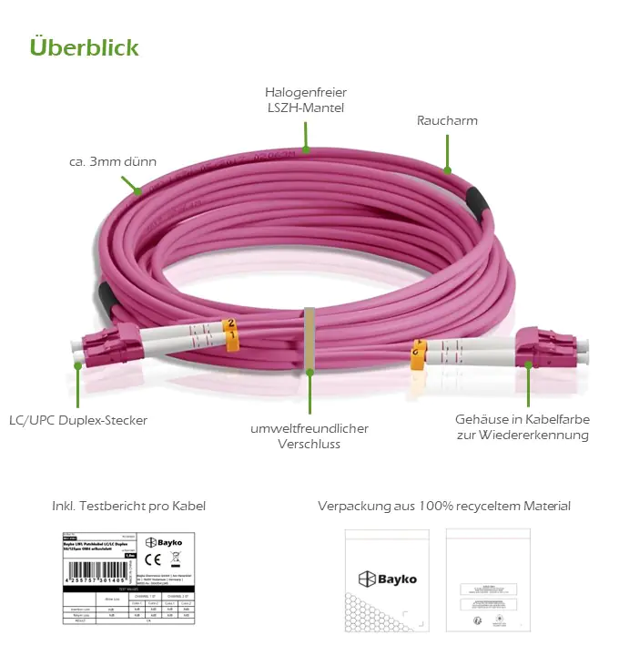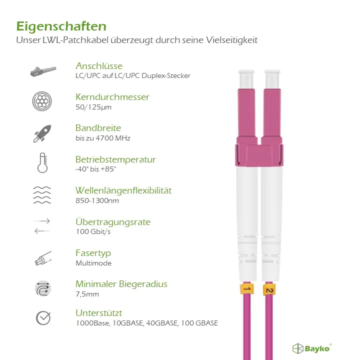 Optimieren Sie Ihre Netzwerkverbindungen mit dem Bayko LWL Patchkabel LC/LC Duplex 50/125µm OM4 in erikaviolett. Hochpräzise gefertigt, garantiert es eine zuverlässige Datenüber und maximale Leistung.