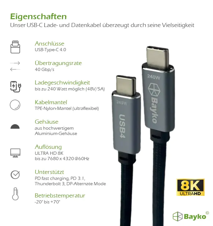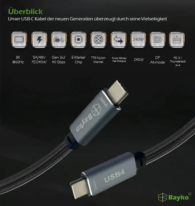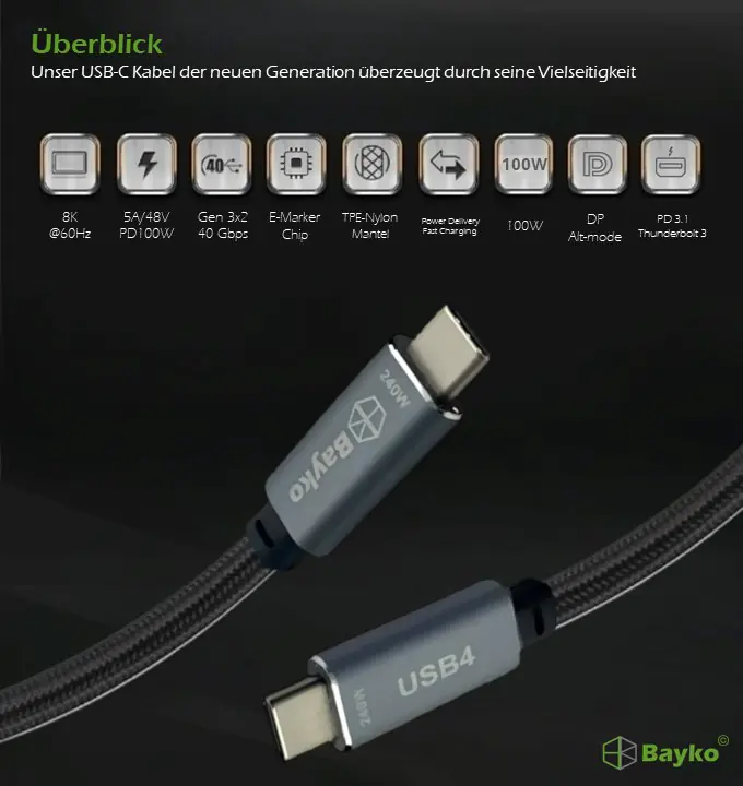 Willkommen in der Zukunft des Datentransfers mit dem Bayko PERFORAMNCE PRO USB-C 4.0 Gen 3x2 Anschlusskabel.
