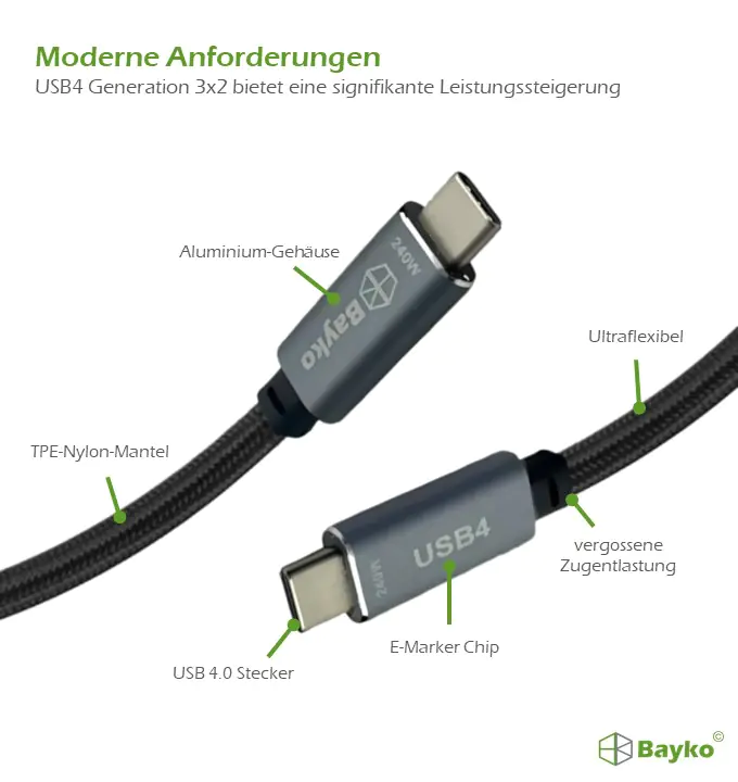 Eleben Sie die nächsten Generation der USB-C Konnektivität - mit dem Bayko PERFORMANCE PRO USB 4.0 3x2 Anschlusskabel.