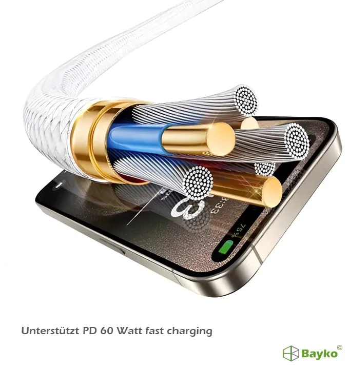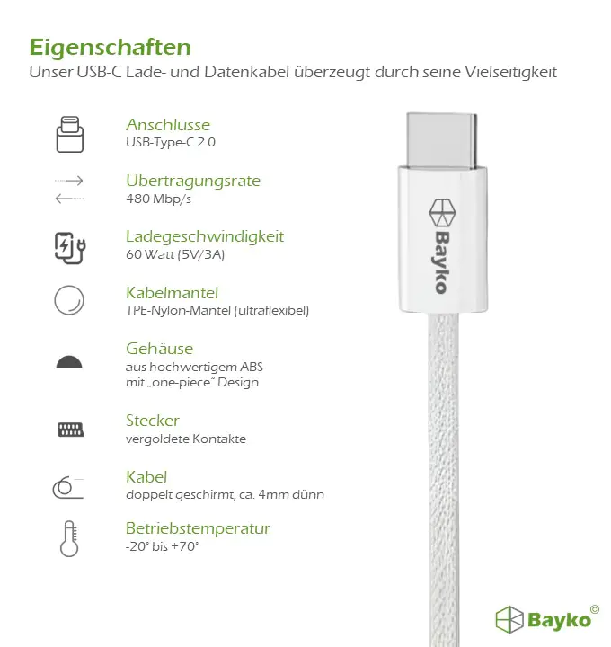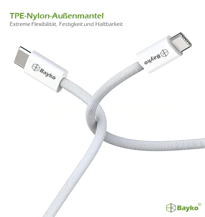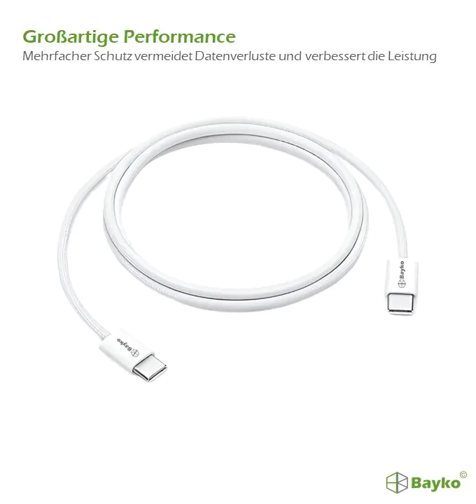 Verlassen Sie sich auf Bayko PERFORMANCE USB-C 2.0 Schnelllade- und Datenkabel für blitzschnelles Laden, immer und überall.