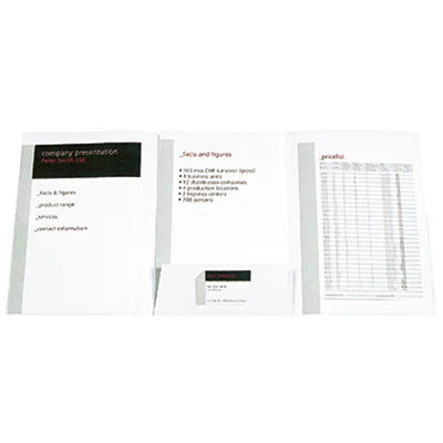 Mit 3 Innenklappen (1 x Rücken, 2 x Dreiecktaschen). Mit Einsteckschlitz für eine Visitenkarte.