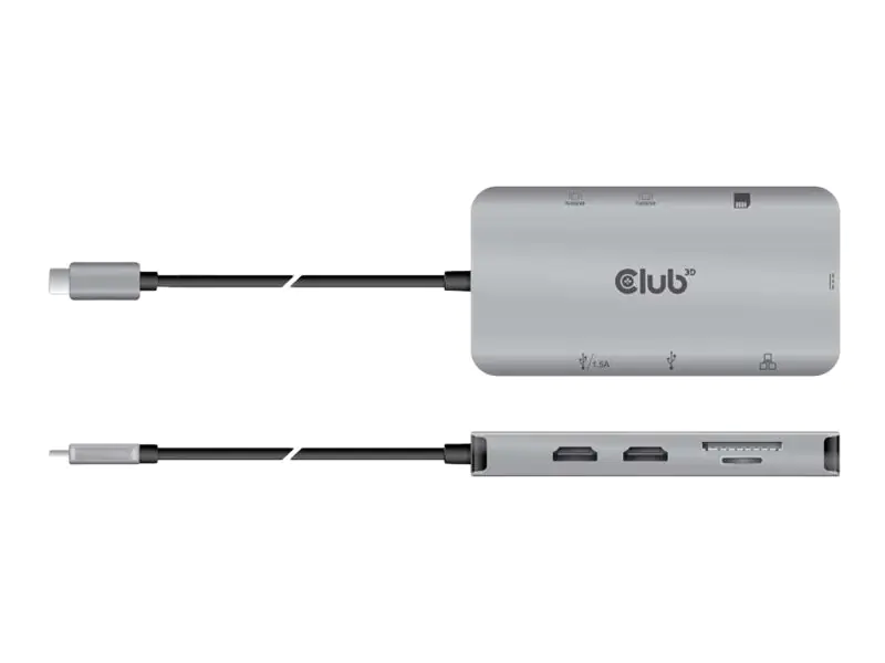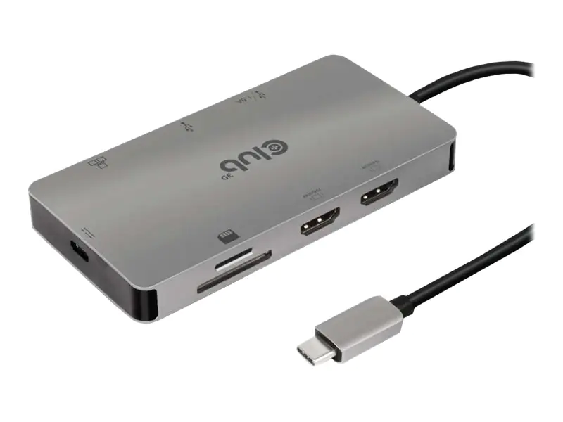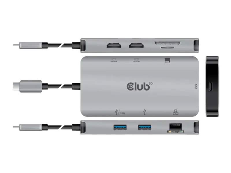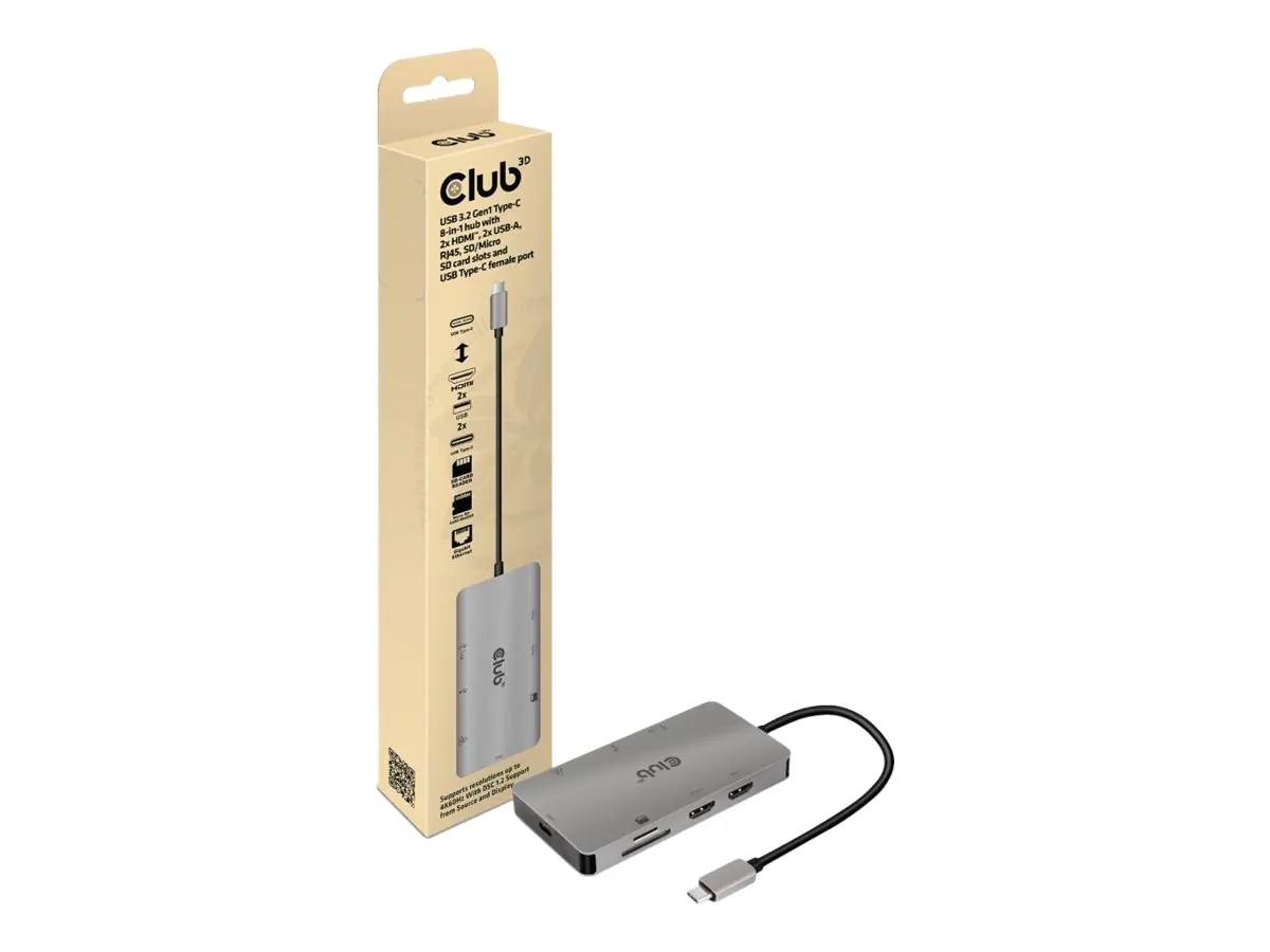 Der Club 3D CSV-1593 USB 3.2 Gen1 Typ-C 8-in-1 Hub mit 2 HDMI, 2 USB-A, RJ45, SD/Micro SD Kartenslots und Typ-C Buchse, liefert die ideale Lösung um Ihren USB 3.2 Gen1 Typ-C oder Thunderbolt 3 Host-Anschluss (PC/Laptop/Smartphone etc.) zu erweitern.