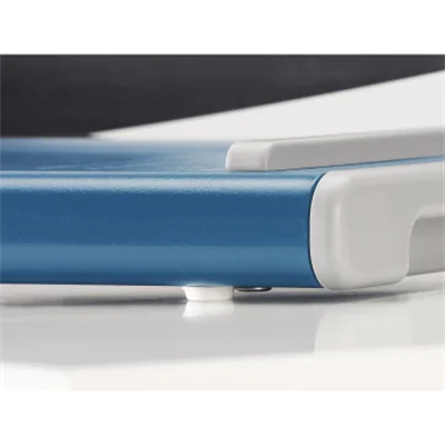 Stabiler Tisch mit abgerundeten Kanten. Rutschfeste Gummifüße. Ergonomisch geformter Handgriff. Ober- und Untermesser aus Stahl. Transparentes Anpreßlineal. Zwei Winkelanlagen mit mm-Skala. Praktische Griffmulde.