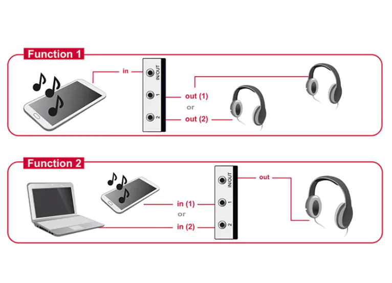 Es können bis zu zwei Geräte mit Klinke Anschluss, wie PC, Laptop oder MP3 Spieler, angeschlossen werden und am Ausgang kann ein Kopfhörer angeschlossen werden. Per Knopfdruck kann ausgewählt werden, von welchem Gerät das Audiosignal am Kopfhörer wiedergegeben werden soll.