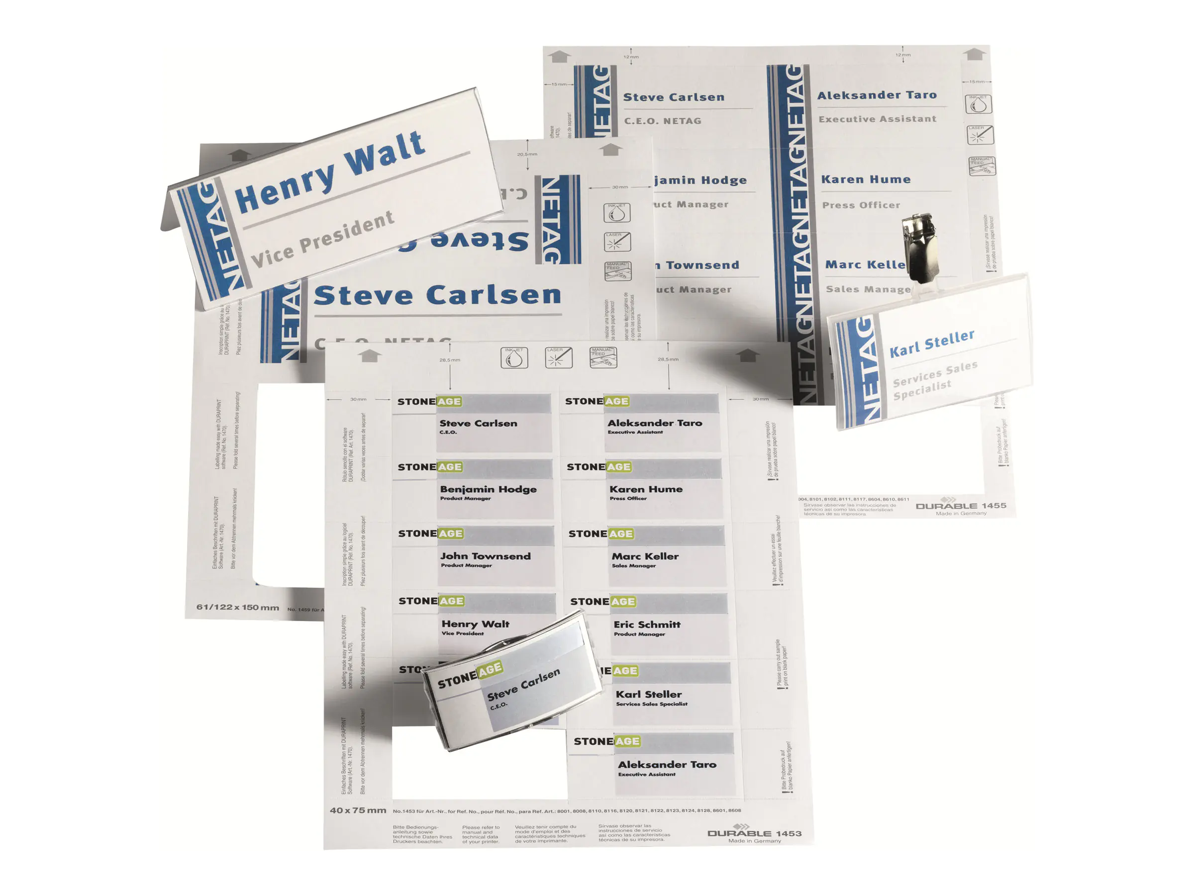 Mikroperforierte Einsteckschilder auf DIN A4 Druckbögen. Einfache Gestaltung durch die Beschriftungssoftware unter www.duraprint.de. Auch als Tischkarte verwendbar.