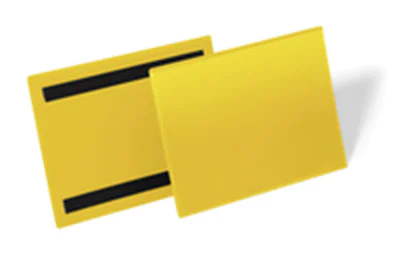 Etikettentasche mit zwei rückseitigen Magnetstreifen. Anwendung an metallischen Oberflächen wie z.B. an Lagerregalen, Lochblechwänden und Metallbehältern.