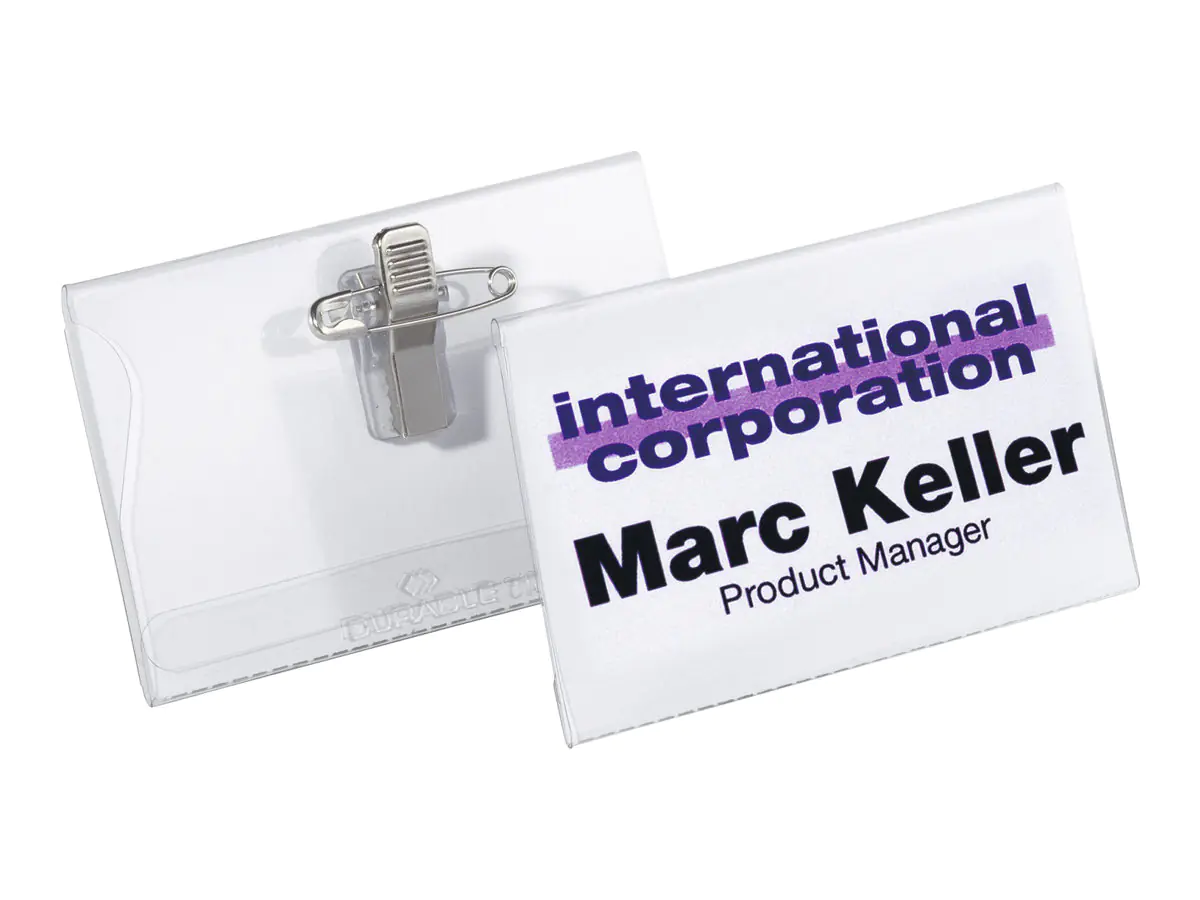 Durable Namensschild mit Kombiklemme. Ausrichtung: Landschaft, Material: PVC, Produktfarbe: Transparent. Breite: 90 mm, Höhe: 54 mm. Menge pro Packung: 50 Stück(e)