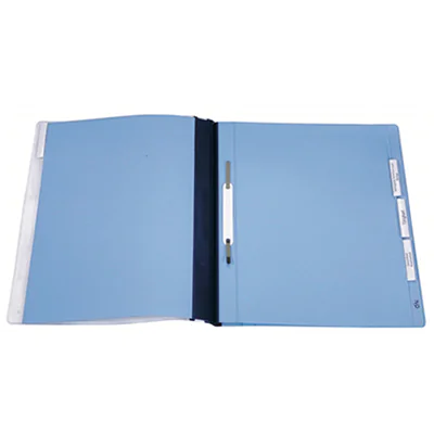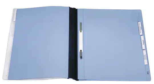 - Rückendeckel aus blauer Folie mit transparenter Innentasche für ungelochte Unterlagen