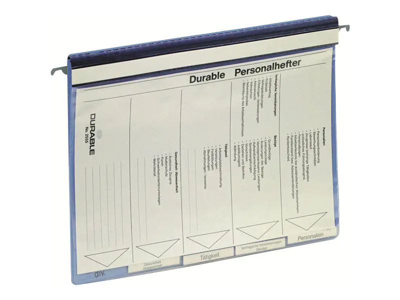 Jede Unterteilung mit reißfestem Grifftab und auswechselbaren Tabeinlagen (bedruckte und blanko Einlagen liegen bei). Vorderdeckel als transparente Sichttasche mit Inhaltsverzeichnis: Personalien, vertragliche Vereinbarungen/Bezüge, Tätigkeit, Gesundheit/Abwesenheit, Diverses (Rückseite blanko für individuelle Einteilung). Mit verschiebbarem Rastreiter, Art. 1893, (60 mm breit) zum Beschriften. Mit Hängeschiene 1531 zur Ablage in Hängeregistratur.