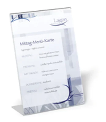 Aufsteller zur Verwendung an Verkaufstheken, Rezeptionen etc. Einseitig verwendbar. Standfest durch selbstklebende Gummifüße. Schnelles und einfaches Auswechseln von Informationen durch seitliche Entnahme.