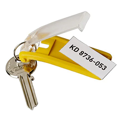 Permanent sichtbares Beschriftungsfeld, da der Schlüssel flach dahinter liegt. Austausch des Schildes durch einfachen Click, ohne Abnahme des Schlüsselrings. Mit Präzisionsvertiefungen zum sicheren Halt an den Schlüsselleisten in der KEY BOX oder am KEY BOARD. Kostenfreier Software-Download unter www.durable.de.
