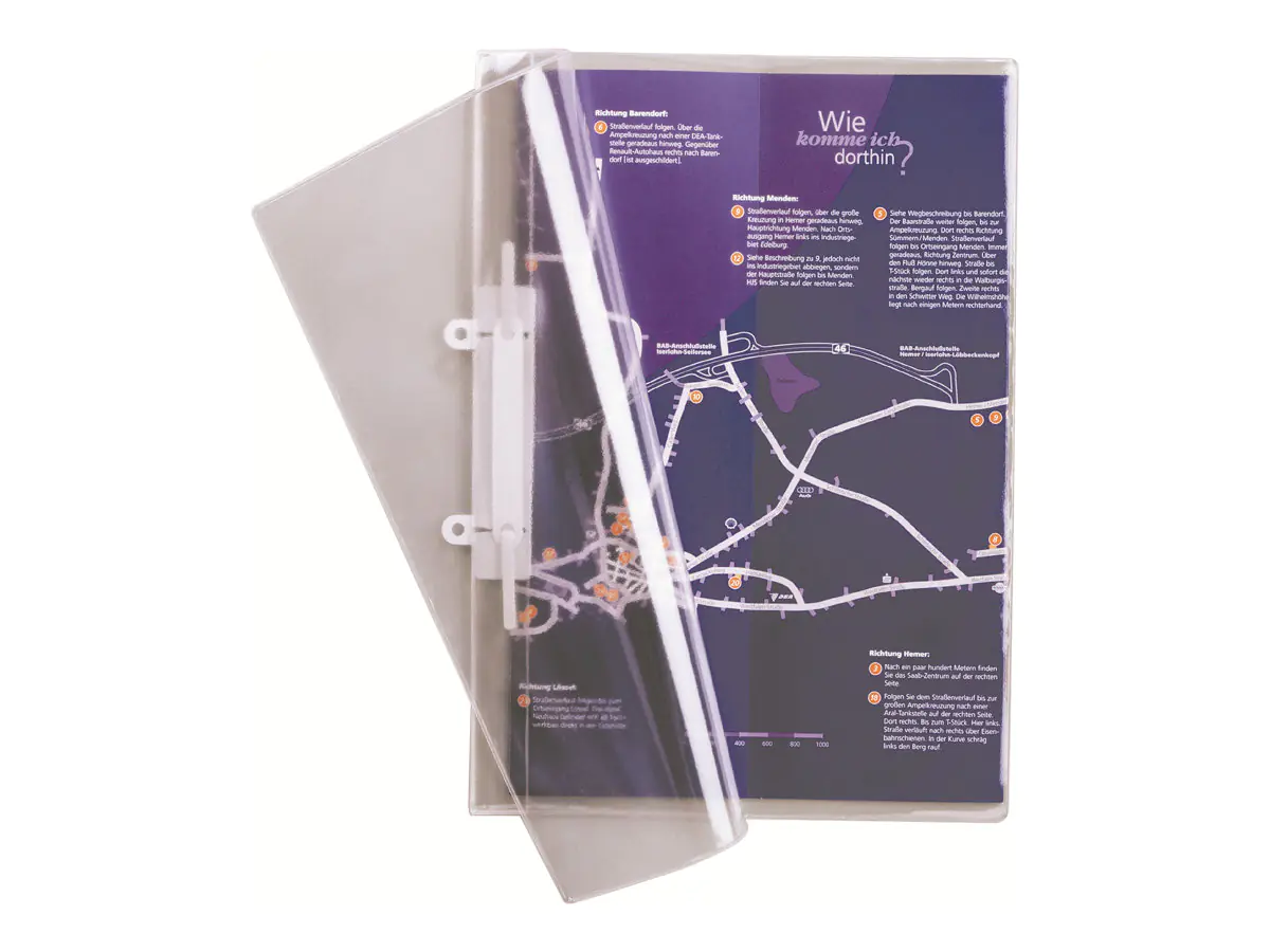 - Aus volltransparenter Weichfolie mit Vorderdeckel als Sichttasche und Innentasche im Rückendeckel