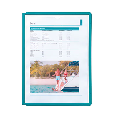 Zur Verwendung mit Aufnahmeelementen mit Zapfenmechanik, scannertauglich, mit 2 verschiedenen Reitern nachrüstbar, 5er und 12er Ablauf möglich. Für z.B. Preislisten, Katalogseiten etc. Mit vollumlaufendem, farbigem Profilrahmen.