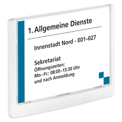 Schilder- und Präsentationssysteme: Ob in Konferenzräumen, am Empfang oder im Lager – die Schilder- und Präsentationssysteme von Durable sorgen für eine klare Kommunikation. Tischaufsteller, Türschilder und Präsentationsmappen sind nicht nur funktional, sondern auch optisch ansprechend und tragen zu einem professionellen Erscheinungsbild bei.
