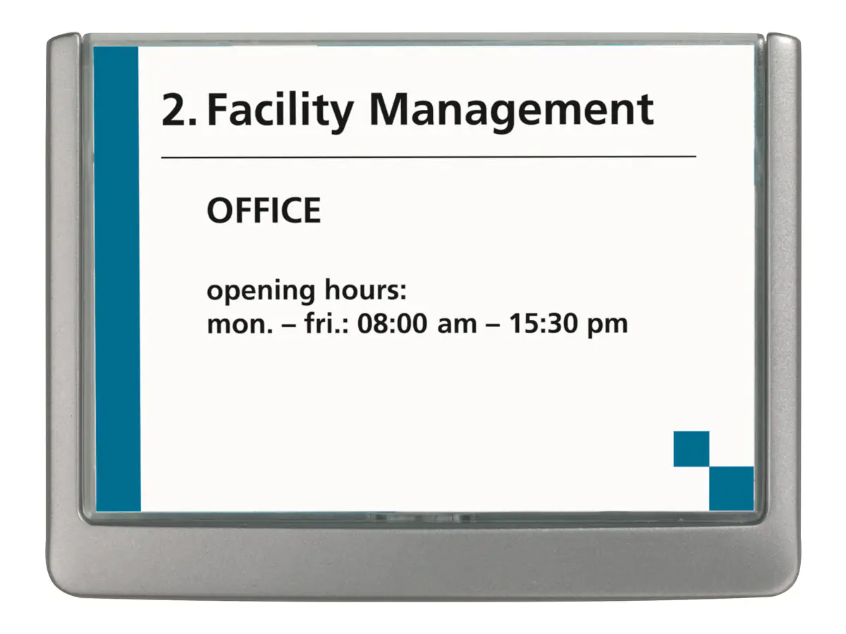 Beschreibung | Durable Click Sign, Grau, 149 mm, 105,5 mm Click Sign 149 x105.5mm | |||