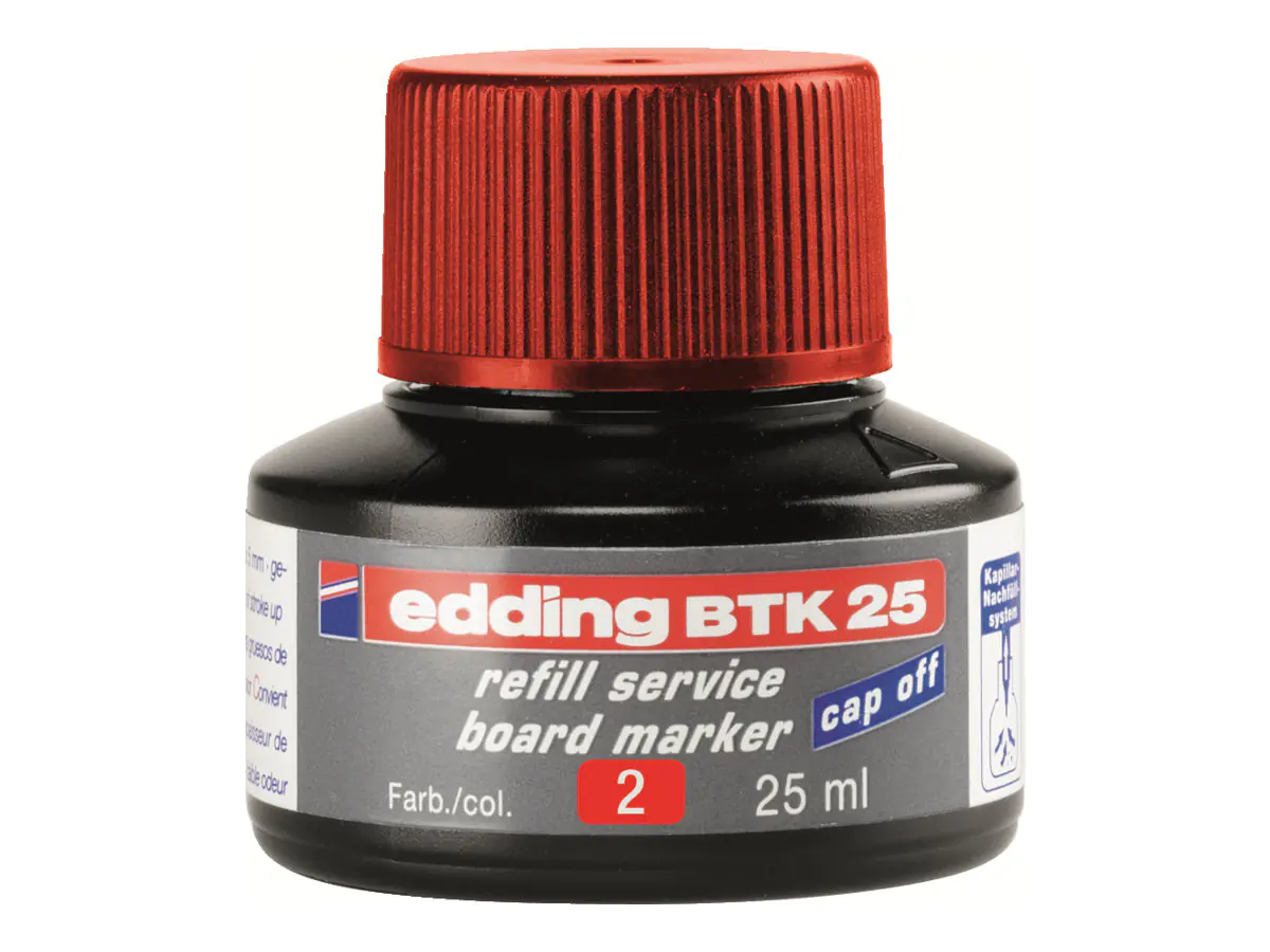 Flasche mit Kapillarsystem. Marker einfach mit der Spitze nach unten in die Refillflasche stellen, nach ca. 1 Stunde ist der Marker wieder schreibbereit. Saubere und eigenständige Nachfüllmöglichkeit zur Verlängerung der Lebensdauer fast aller edding Whiteboardmarker. Einfache Handhabung. Nachfüllen ist umweltfreundlich, da die Abfallmenge reduziert wird.