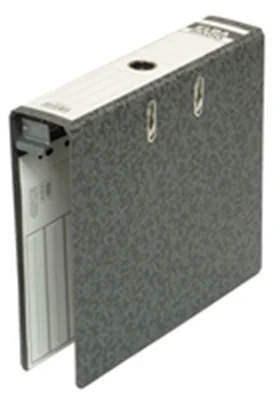 Hängeordner mit aufgeklebtem Rückenschild, die seitlich am Rücken genieteten Beschläge aus Metall werden zum Hängen aus- oder zum Stellen eingeklappt. Präzise schließende Hebelmechanik mit Niederhalter.