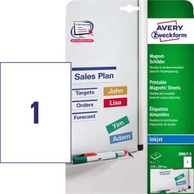 Verwenden Sie die Magnetschilder von Avery Zweckform für Besprechungen. Drucken Sie Ihre Ideen, Arbeitsschritte oder die Namen Ihrer Team-Mitglieder auf die Schilder und heften Sie diese an Ihr Flipchart. Die Magnet-Schilder sind besonders gut geeignet für das Sortieren von Ideen, aber auch für wechselnde Hinweisschilder oder für Urlaubs- und Schichtplanung auf einer Magnettafel. Gestalten und bedrucken Sie die Magnetschilder mit den anwendungsfreundlichen Druckvorlagen und der benutzerfreundlichen Software von Avery Zweckform. Achtung: Die Magnet-Schilder weisen ein hohes Gewicht auf. Bitte stellen Sie vor dem Bedrucken sicher, dass Ihr Inkjet-Drucker dickes und schweres Material verarbeiten kann. Informationen hierzu finden Sie in Ihrem Drucker- Handbuch.