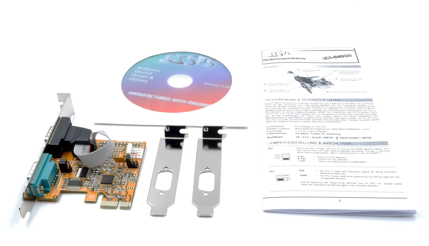 Die EX-44082 PCIe I/O Karte stellt zwei serielle RS-232 High Performance UART 16C550 Ausgänge zur Verfügung. Sie ist entwickelt worden, um zwei weitere Serielle Ports für PC, kleine Workstation oder Server über den PCIe Bus zu erweitern. Die Karte ist voll Plug-and-Play kompatibel. Zusätzlich ist +5V oder +12V auf Pin 9 des seriellen Steckers konfigurierbar für ein POS System (Power over System). Mit der EX-44082 wird ein Low Profile Bügel mitgeliefert zum Einbauen in schmale Computergehäuse bis 8 cm Bauhöhe.